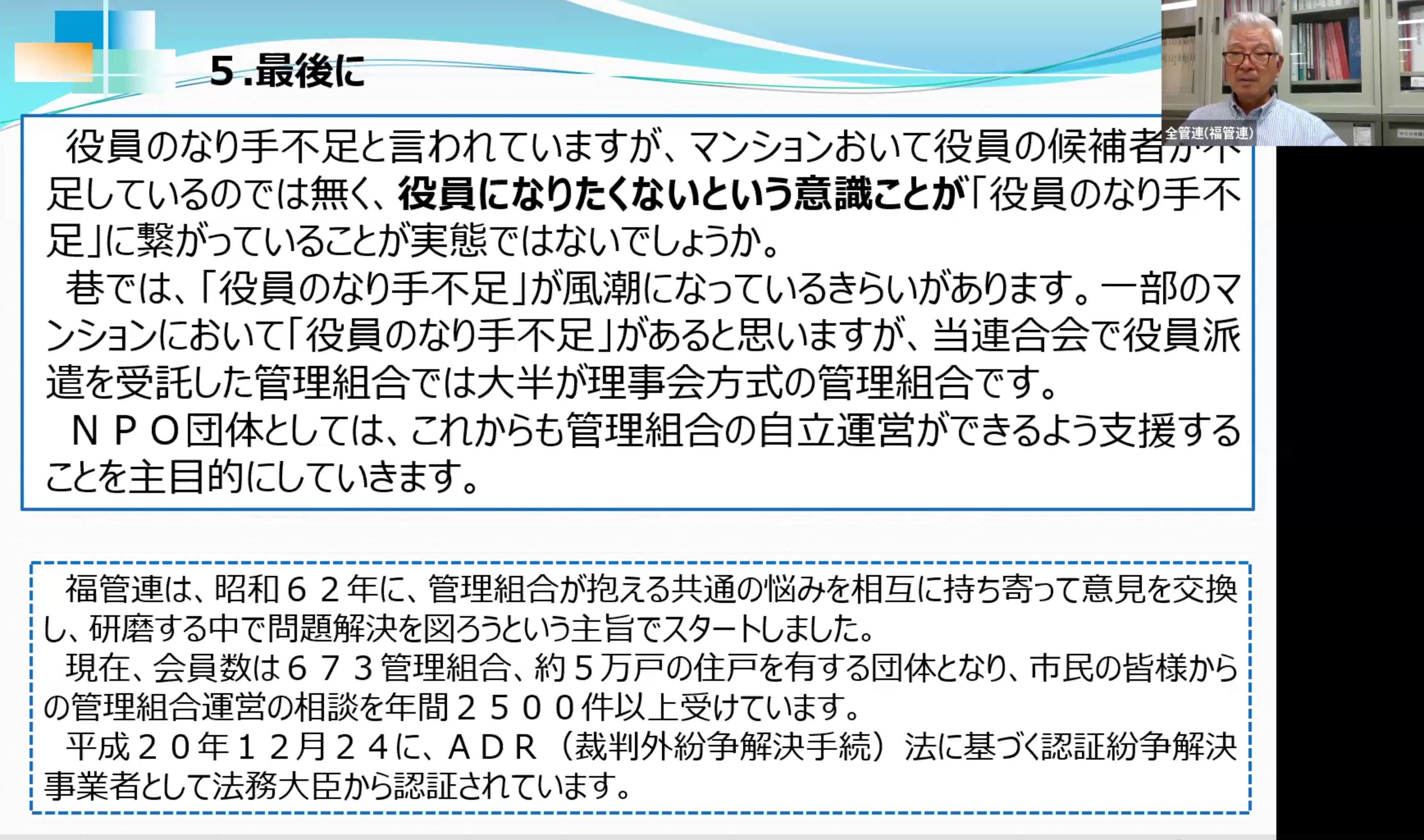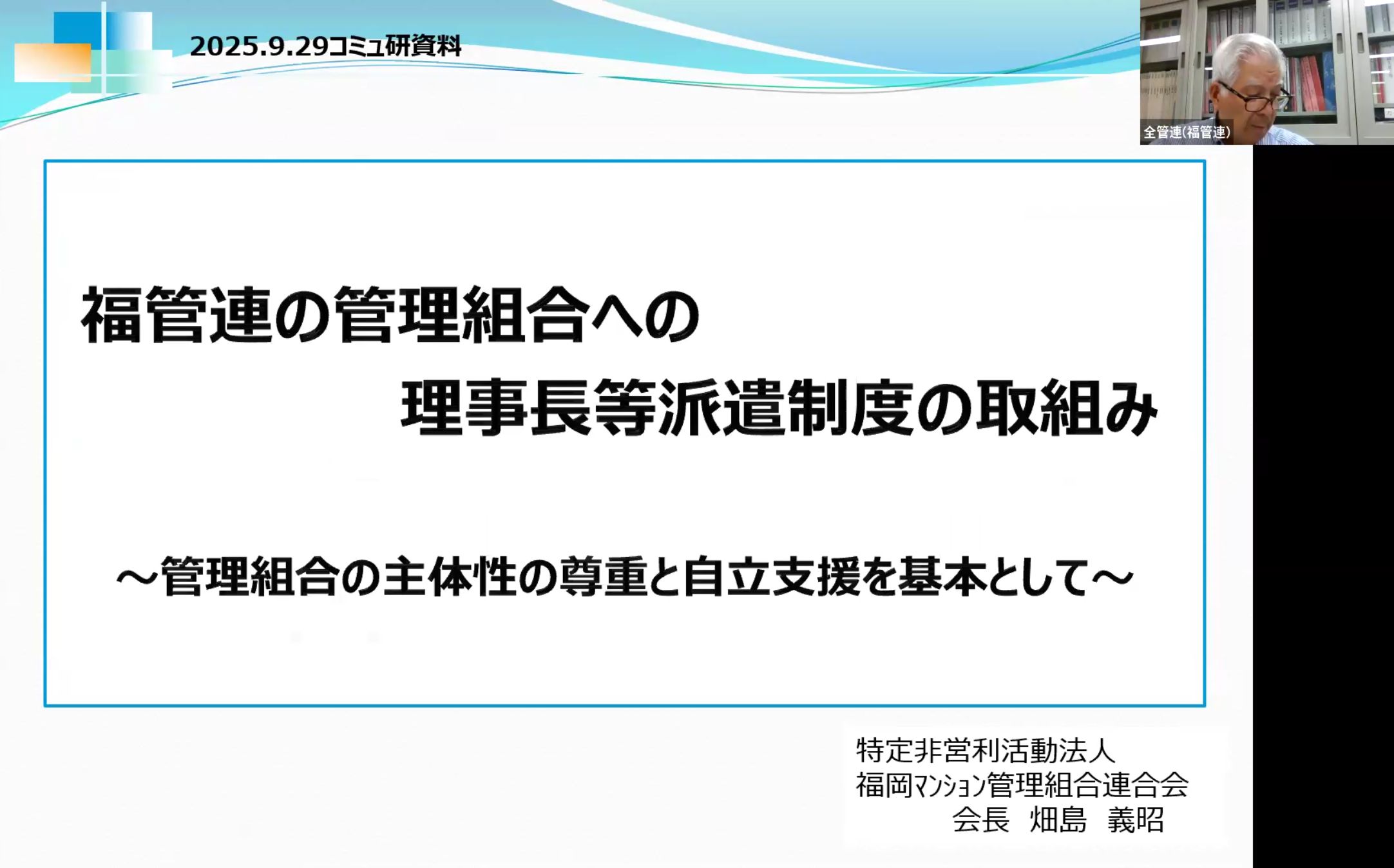 1.日 時:令和7(2025)年9月29日(月)19:00 ~ 20:30 2.第115回勉強会テーマ「福管連の管理組合への理事長等派遣制度の取組み」 ~管理組合の主体性の尊重と自立支援を基本として~ 講師:畑島 義昭氏 NPO法人福岡マンション管理組合連合会 会長 NPO法人全国マンション管理組合連合会 会長 20年前「理事会内部で対立が激化し、大声で怒鳴り合うだけで案件が進まない。福管連の役員さんから理事長職を派遣してもらえないか」との申し出があり、理事長職等の派遣制度を検討し開始しました。 これまで派遣した管理組合は47件。就任期間は、原則3年間とし、延長期間は2年程度としています。 理事会において理事会運営の仕方から丁寧にサポ―トを始めると、管理運営が自分たちでできるようになることを基本に進めているといいます。 自分たちで決めることをサポートしていく試みは非常に有効だと思います。きめ細かい取り組みについてお話を伺います。 4.資料 5.議事録 |