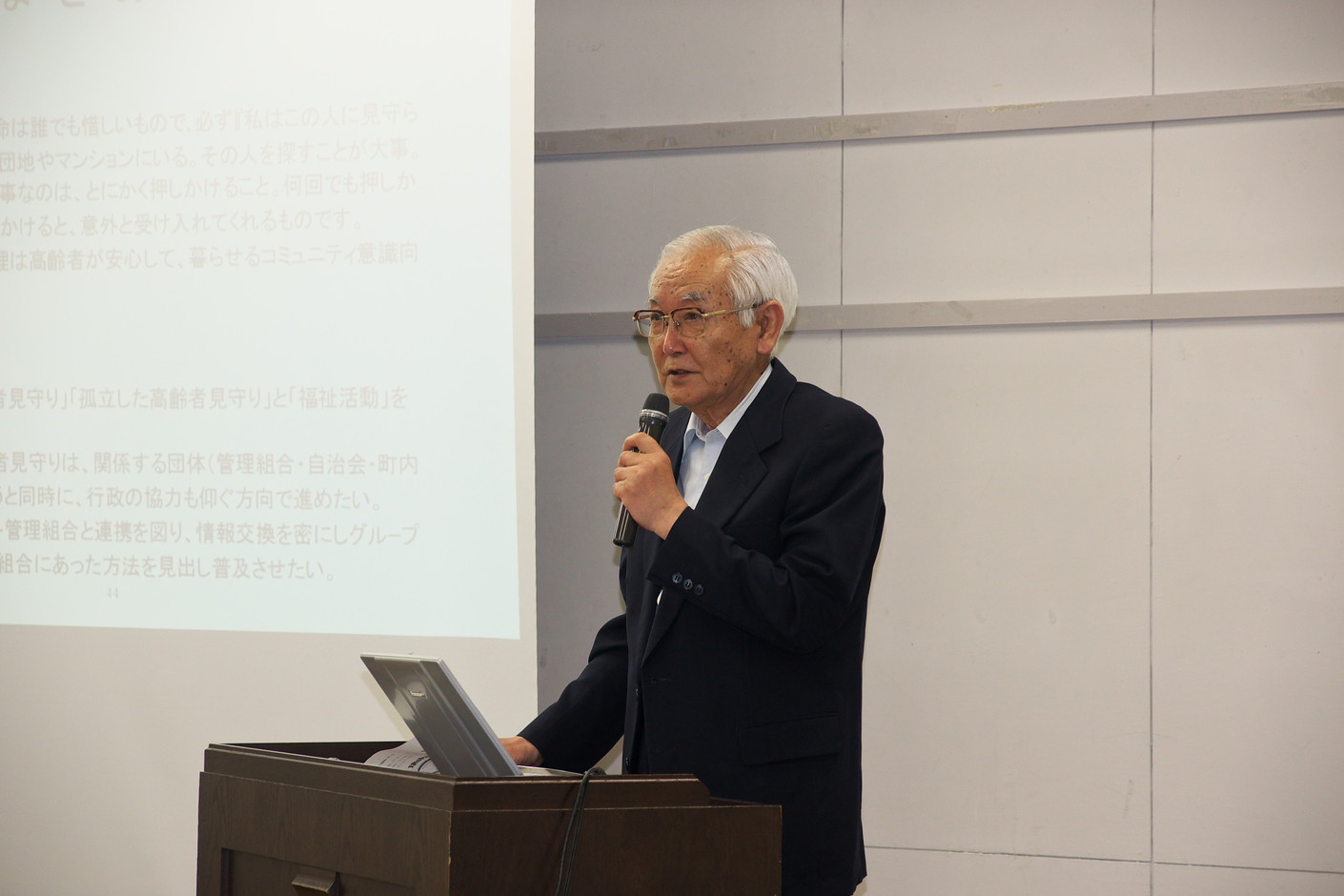 次いで、西山氏を師と仰ぐマンション管理士の中西博氏が、自身が居住するマンションで実践した高齢者支援活動を紹介しました。