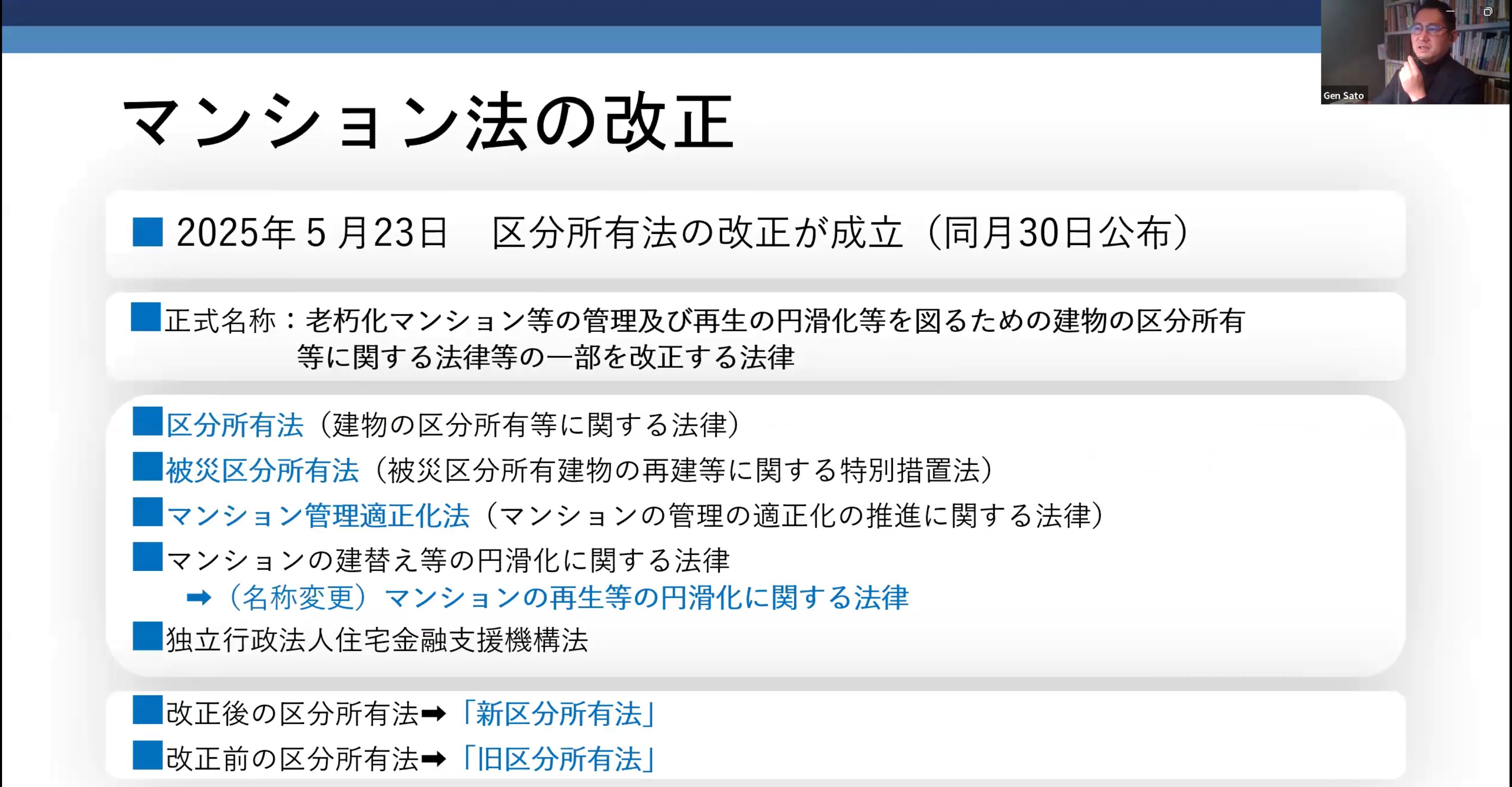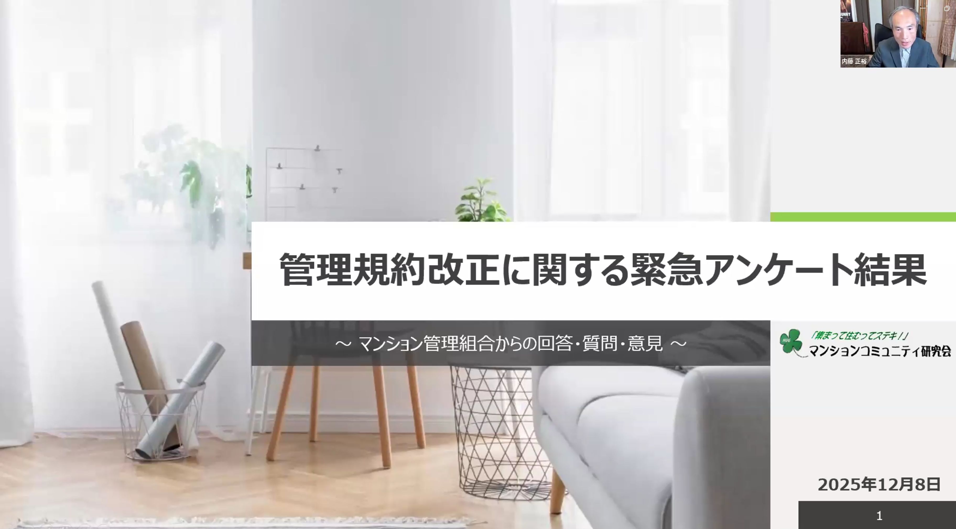 | 【第32回フォーラム】 テーマ:「標準管理規約の改正に管理組合はどう取り組むか」 日 時:12月8日(月)19:00~21:30 方 法:オンライン開催(Zoomウェビナー) 参加者:マンションコミュティ研究会会員(正会員、賛助会員) 参加希望者 (今回、当日のフォーラムは広く無料参加して頂けるようにしました) 《プログラム》 [基調講演] 佐藤 元 氏 弁護士 横浜マリン法律事務所所長 横浜市立大学都市社会文化研究科客員准教授 [管理規約改正に関する緊急アンケート結果] マンションコミュニティ研究会 内藤 正裕 理事 [パネルデスカッション] 一般社団法人日本マンション管理士会連合会会長 瀬下 義浩 氏 NPO法人全国マンション管理組合連合会理事 藤木 賢和 氏 (佐藤氏、瀬下氏、藤木氏は、国土交通省主催の平成7年マンション関係法改正等に伴うマンション標準管理規約の見直しに関する検討会のメンバーです。) それにマンションコミュニティ研究会から、植田雅人理事、小杉学理事(共に日本マンション学会理事)が加わり、標準管理規約改正の趣旨を踏まえ、選択可能部分についてどこまで管理組合として取り組むか等のお話をしていただきました。 コーディネーター:廣田信子 |